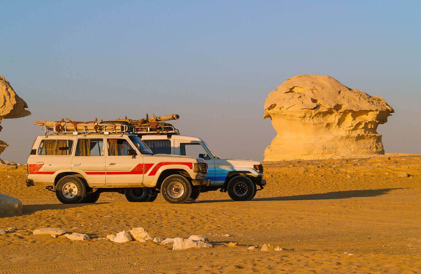 Wake up to the crisp desert air and a hearty breakfast, fueling up for a thrilling day of exploration. Hop into a rugged Land Cruiser, ready to traverse Egypt’s diverse desert terrain, from smooth roads to untamed, off-road paths.